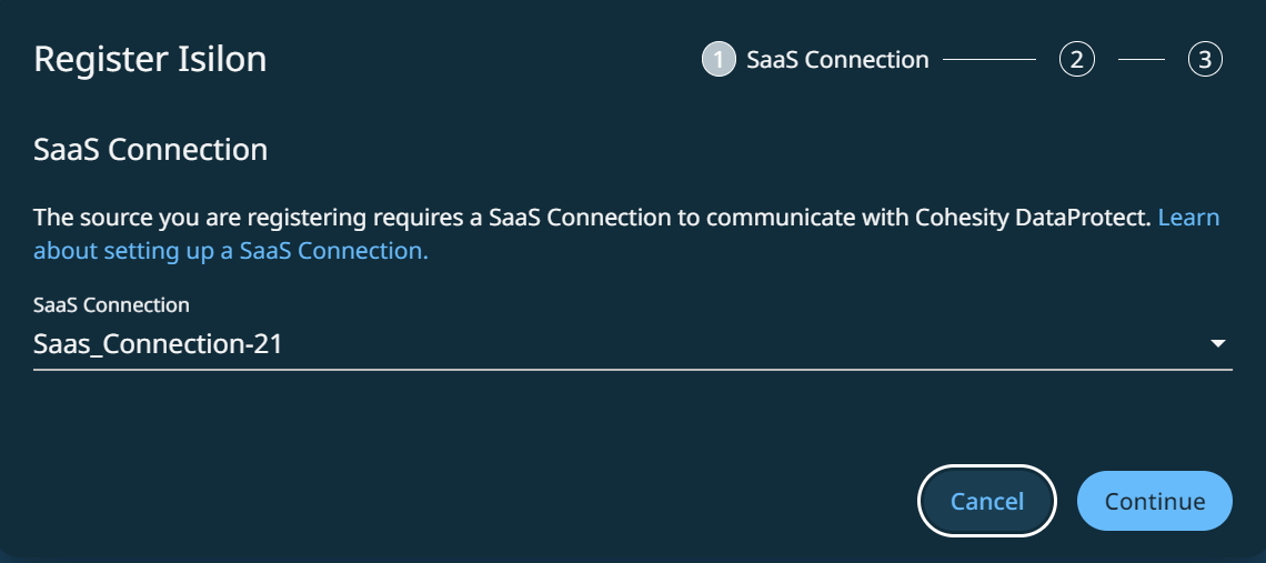 In the Register Isilon dialog box, select an existing SaaS connection marked Unused or click Create SaaS Connection and follow the instructions in Deploy SaaS Connector, and then click Continue.