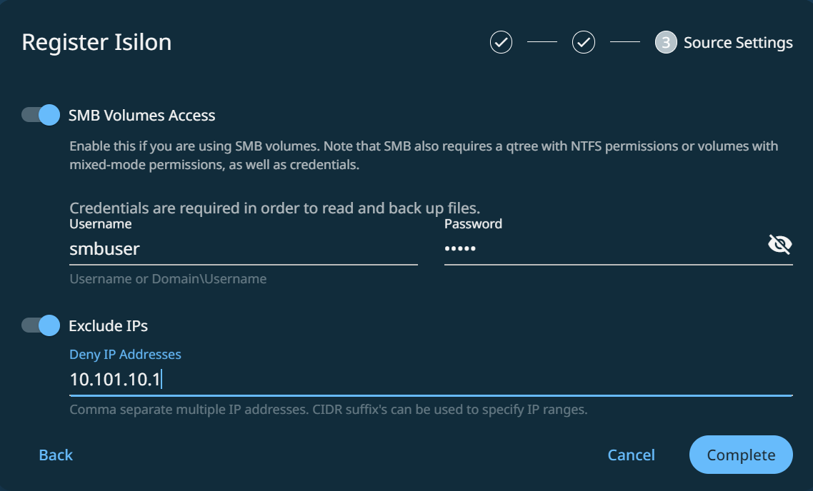 To exclude IP addresses or subnets from the communications between Cohesity Cloud Protection Service and the Isilon cluster, enable Exclude IPs and enter those IPs.