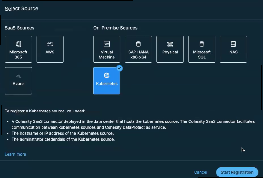 In the Select Source dialog box, select Kubernetes and click Start Registration.