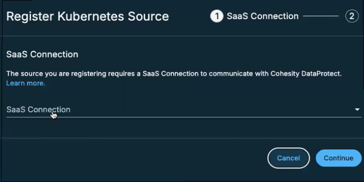 In the Register Kubernetes Source dialog box, select an existing healthy SaaS connection marked Unused, or click Create SaaS Connection, follow the instructions in Deploy SaaS Connection and then click Continue.