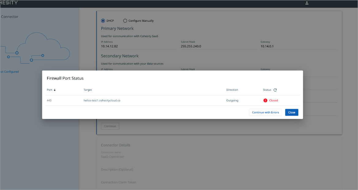 The SaaS Connector verifies the network connection to the Cohesity SaaS service using the primary network. Click Close if the verification is successful or if errors are found during the verification process. You can also click Continue with Errors to ignore the errors and continue using the SaaS Connector.