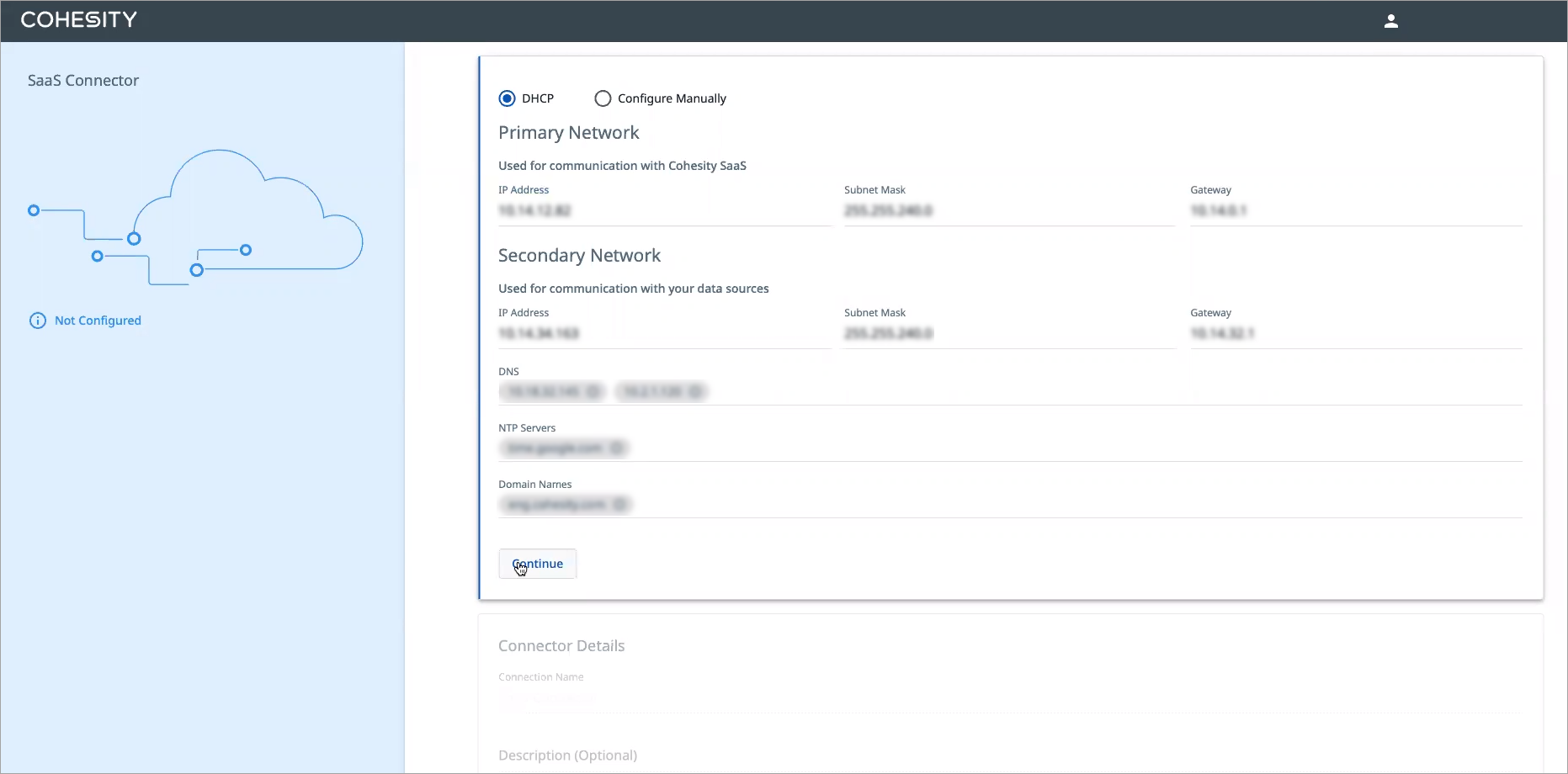 Select DHCP to change the network configuration from static IP addresses to DHCP, then click Continue.