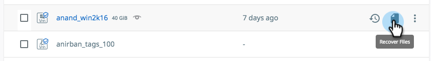 Locate the source object containing the files and click Recover Files on the row for that object to open the Select Files form.