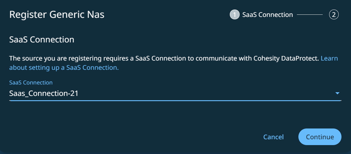 In the Register Generic Nas dialog box, select an existing SaaS connection marked Unused or click Create SaaS Connection and follow the instructions in Deploy SaaS Connector, and then click Continue.