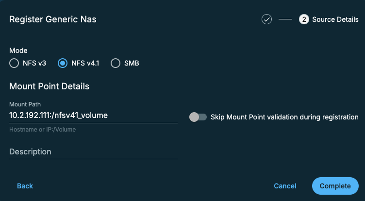 To register your generic NAS source via NFS or SMB: