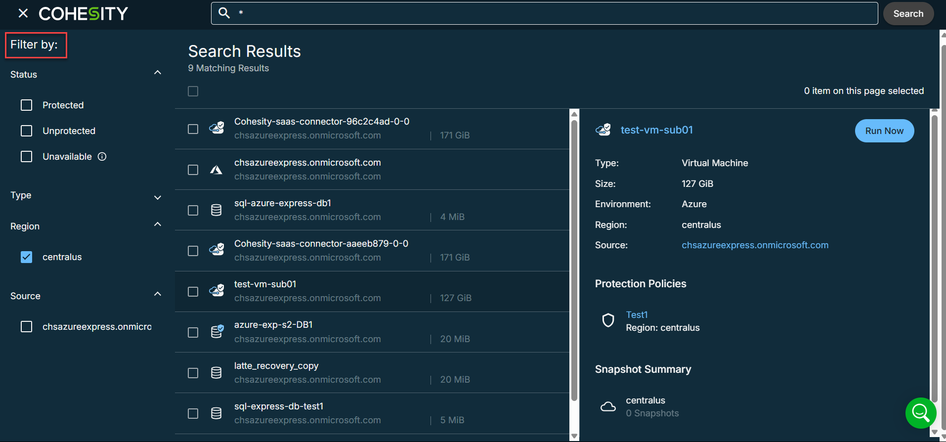 Cohesity allows you to search for objects, such as files, document libraries, storage volumes, and databases. You can then refine the search results and perform actions on the objects.