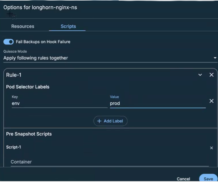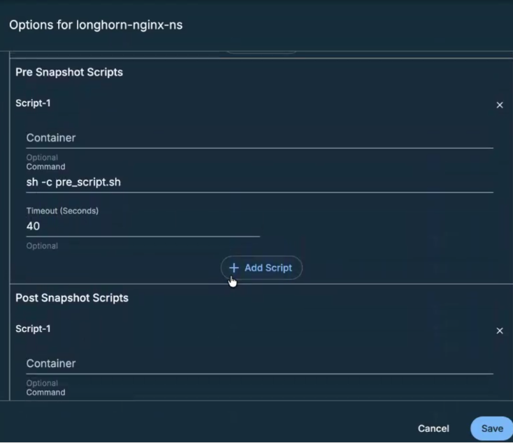 - Enter the container name, the command that needs to be run, and the timeout value in seconds. You can add multiple scripts by clicking Add Scripts for a particular rule selected under Pre Snapshots Scripts.