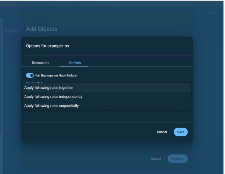 Fi - You can choose between "True" or "False" to indicate whether the backup should continue or fail when the script fails by selecting Continue Backup when Script fails. If the script fails, the protection job will still back up the PVC. However, if the script fails, the protection job will also fail.