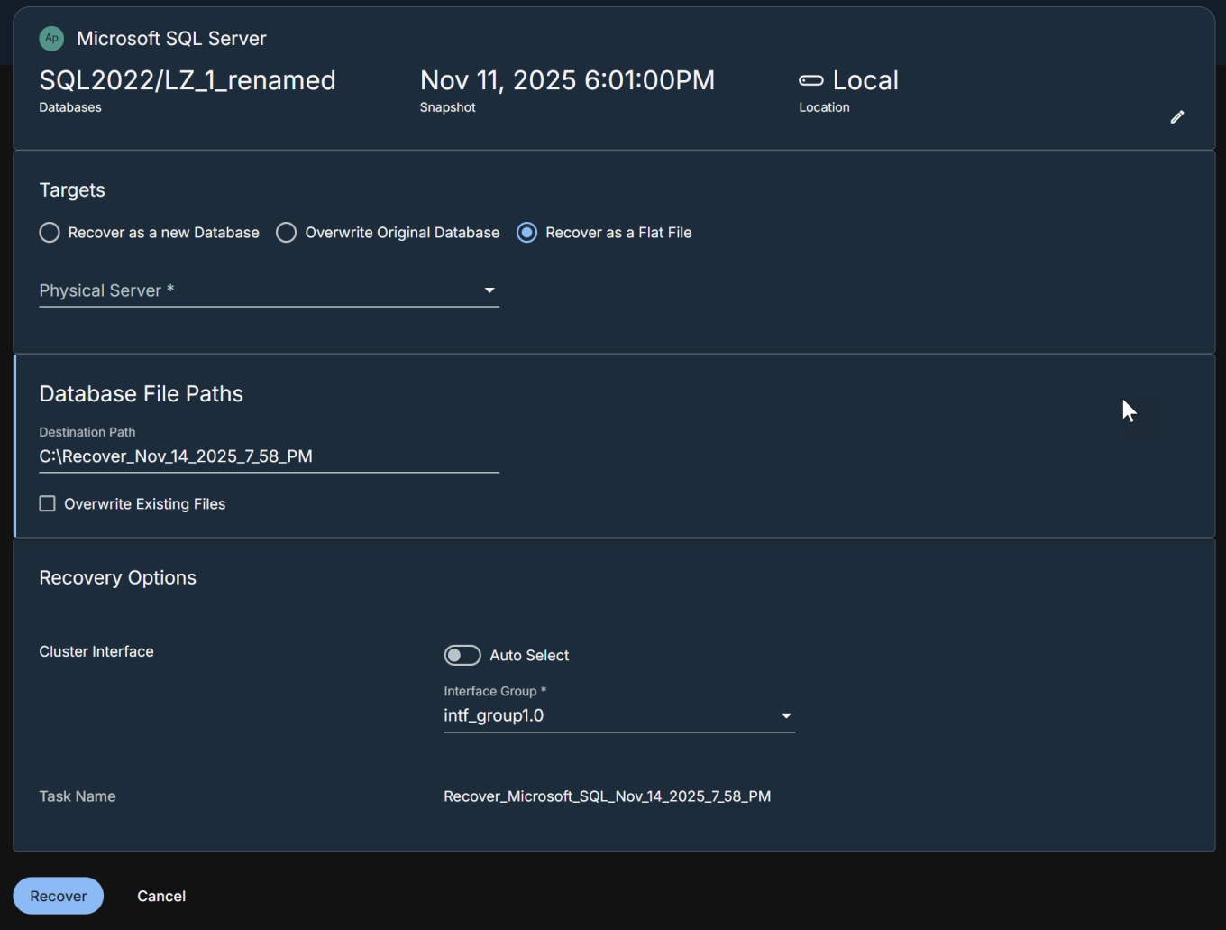 Cluster Interface: By default, the Auto Select option is enabled, and the recovery task automatically selects the correct VLAN. If you disable this option, then select a configured interface group from the Interface Group drop-down.